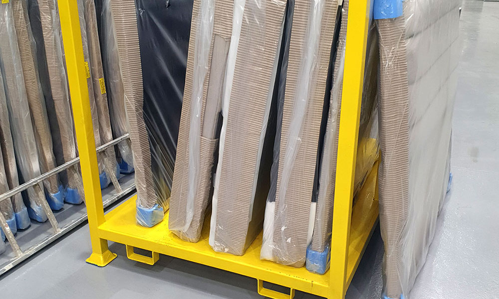 Our steel stillages (post pallets) are ideal for separating goods for easy storage or during the production process. This example has forklift channels at the bottom for safe moving and an open front for easy filling.